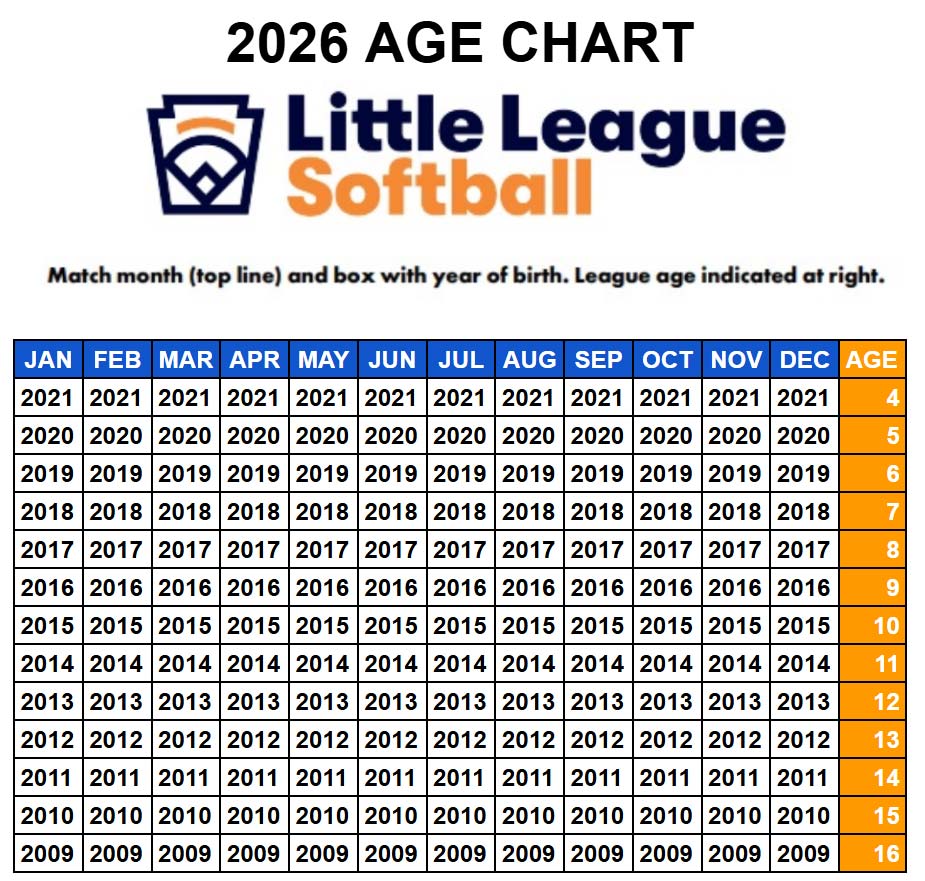 Age rules remain unchanged; please register players based on age as of Jan 1, 2026. If a player was 10 years old on Jan 1, 2026 and turns 11 on March 1, 2026: league age is 10 years old and the player should register in 10U division. Please refer to the official age chart below.
